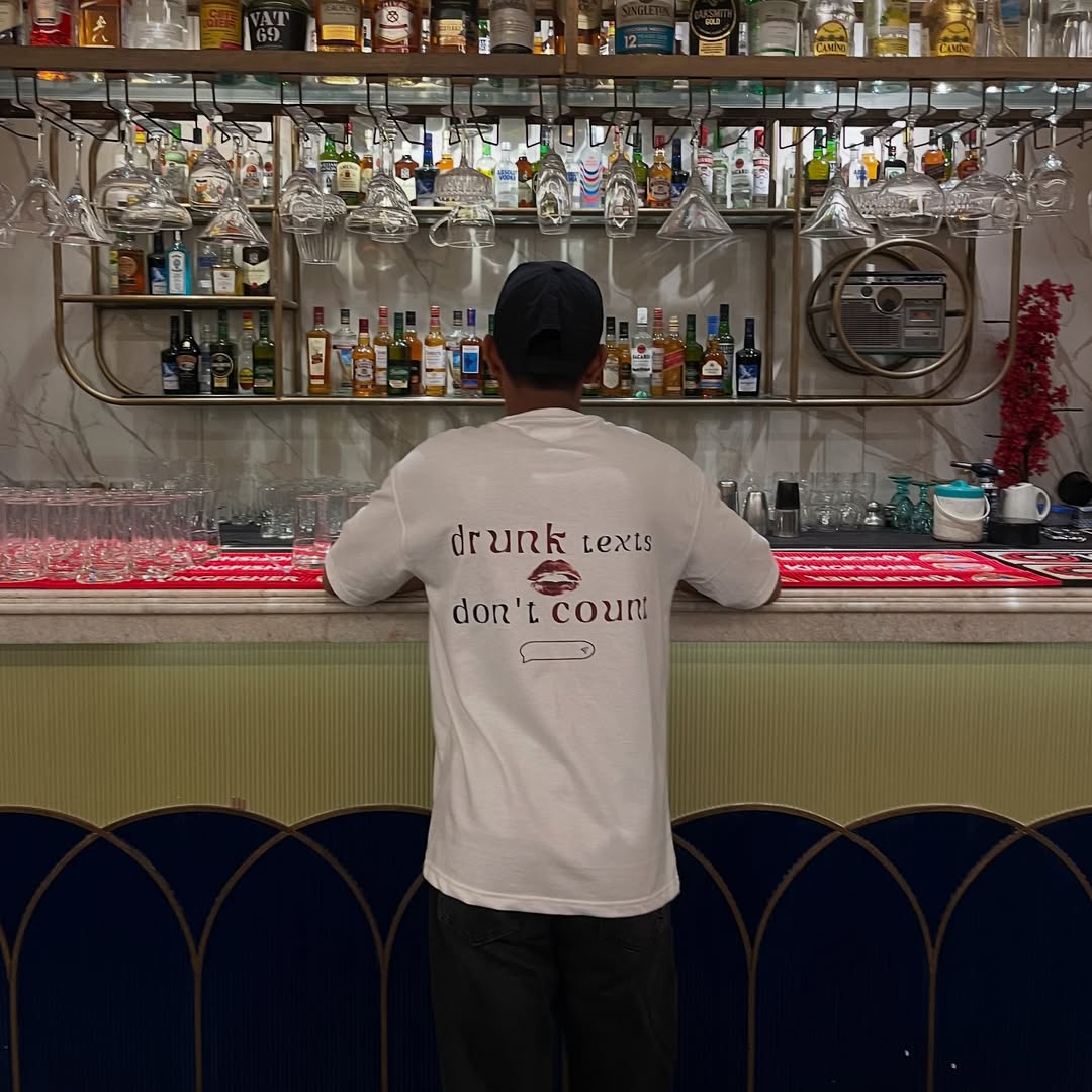 Let the tee do the explaining. The "Drunk Texts Don’t Count" oversized t-shirt from kosine is a cheeky, bold statement for the late-night texters and unapologetic hearts. Featuring a playful kiss print, typewriter-style typography, and a minimal front chest graphic, this design balances sarcasm with style.